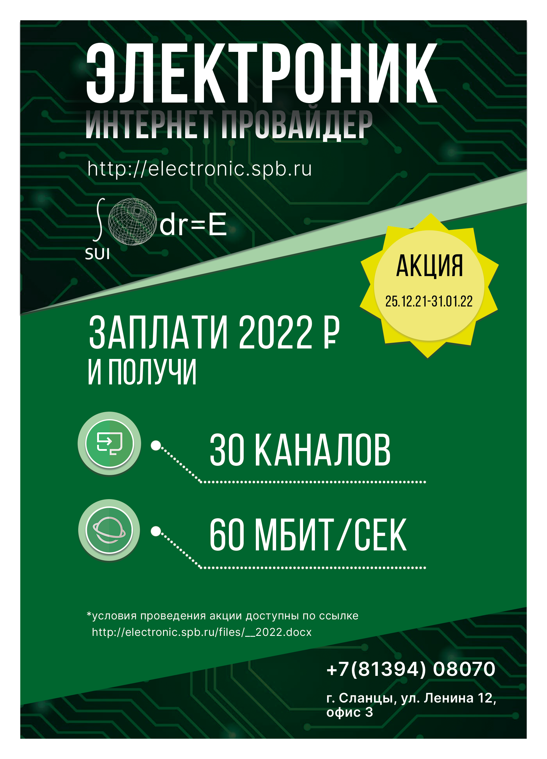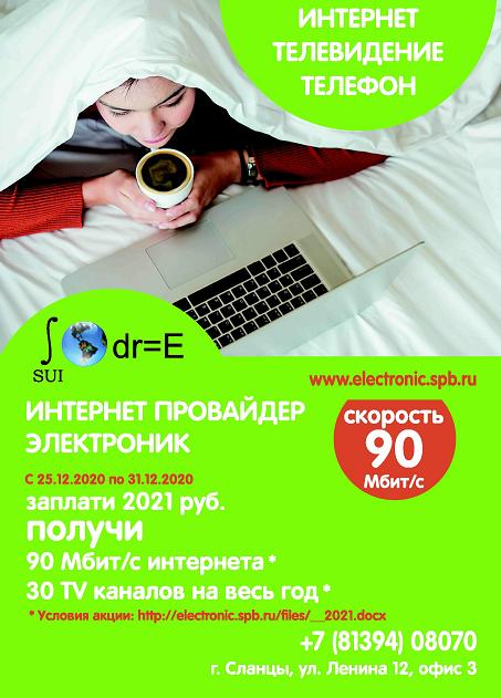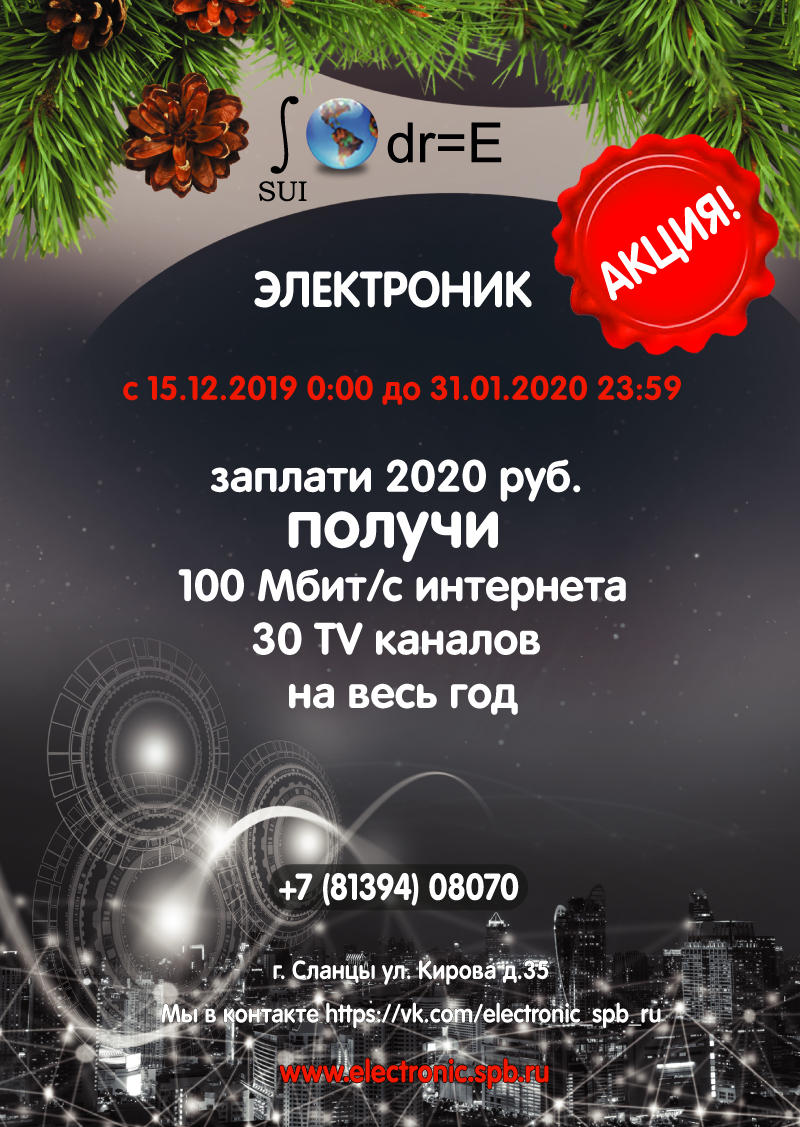 15.12.2019 Компания Электроник начинает проведение акции оплати 2020 рублей и получи год интернета бесплатно. Подробности акции можно