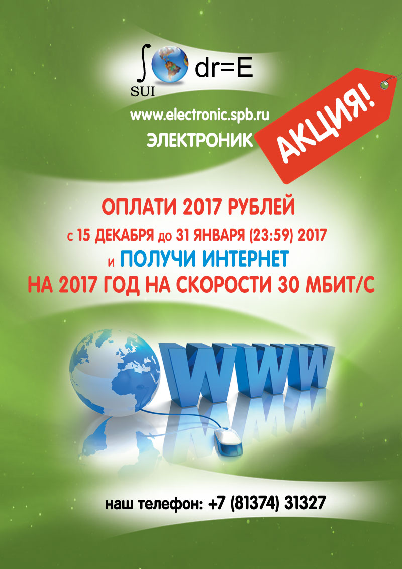 15.12.2016 С 15.12.2016 по 31.01.2017 Стартует акция: заплати 2017 рублей и получи интернет на 2017 год на скорости 30 Мбит/с.